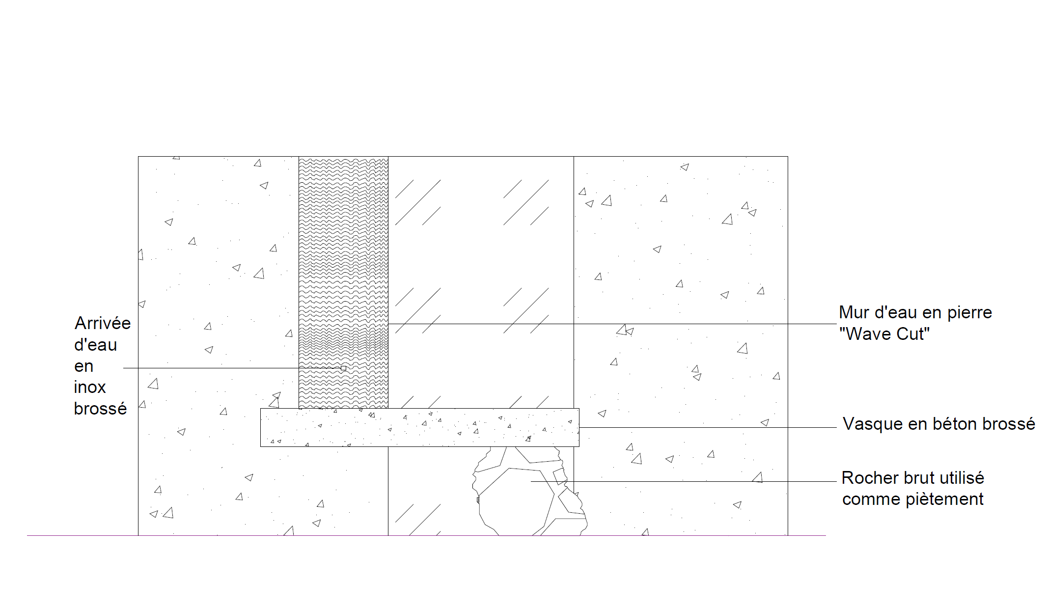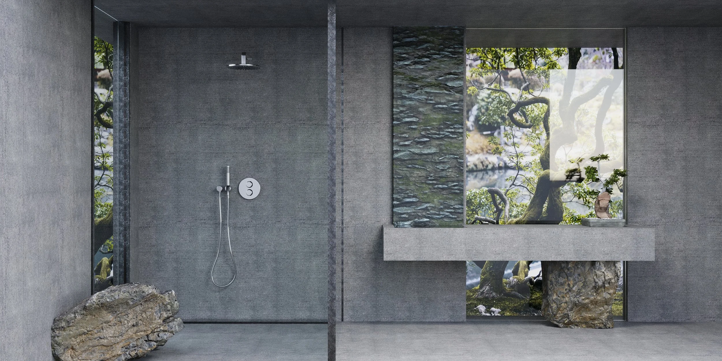 Imaginer une vasque de salle de bain. Voilà ce qu’on m’a demandé. J’ai voulu créer un espace zen et pur autour de la nature. Pour ce faire, j’ai intégré une roche en guise de support de vasque. Le monolithe est couvert de béton rainuré.