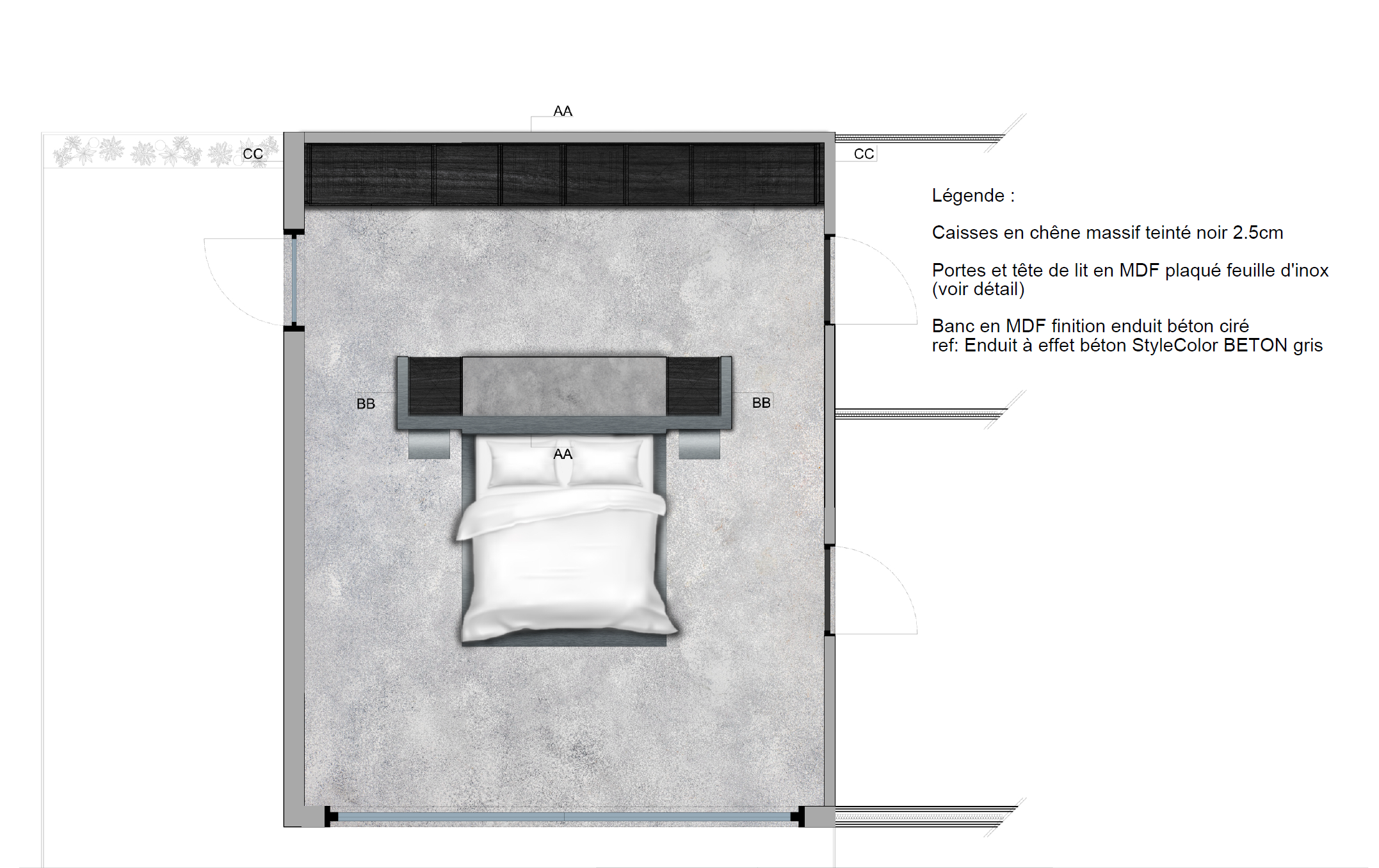 Les caissons principaux sont réalisés en chêne massif teinté noir, noble et chaleureux, tandis que les portes sont habillées de plaquage feuille d’inox, apportant une touche sophistiquée et moderne. Certaines parties restent ouvertes, offrant un rendu plus léger et une circulation visuelle fluide. Des étagères et niches intégrées viennent organiser l’espace avec harmonie, et des détails sur-mesure renforcent l’identité unique de ce dressing, pensé comme un véritable écrin pour leur quotidien.